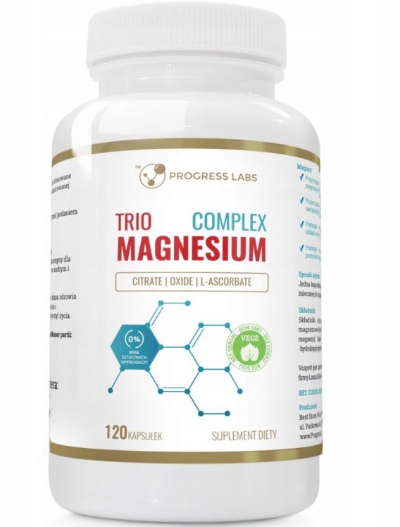 Progress Labs Trio Magnesium Complex 120 kapsułek to suplement diety, który kryje w sobie aż 3 różne formy magnezu: cytrynian, tlenek oraz l-askorbinian. Zostały one dobrane w taki sposób, aby zwiększyć przyswajalność i efektywność suplementacji. Kapsułki są łatwe do połknięcia i przeznaczone do codziennego stosowania.